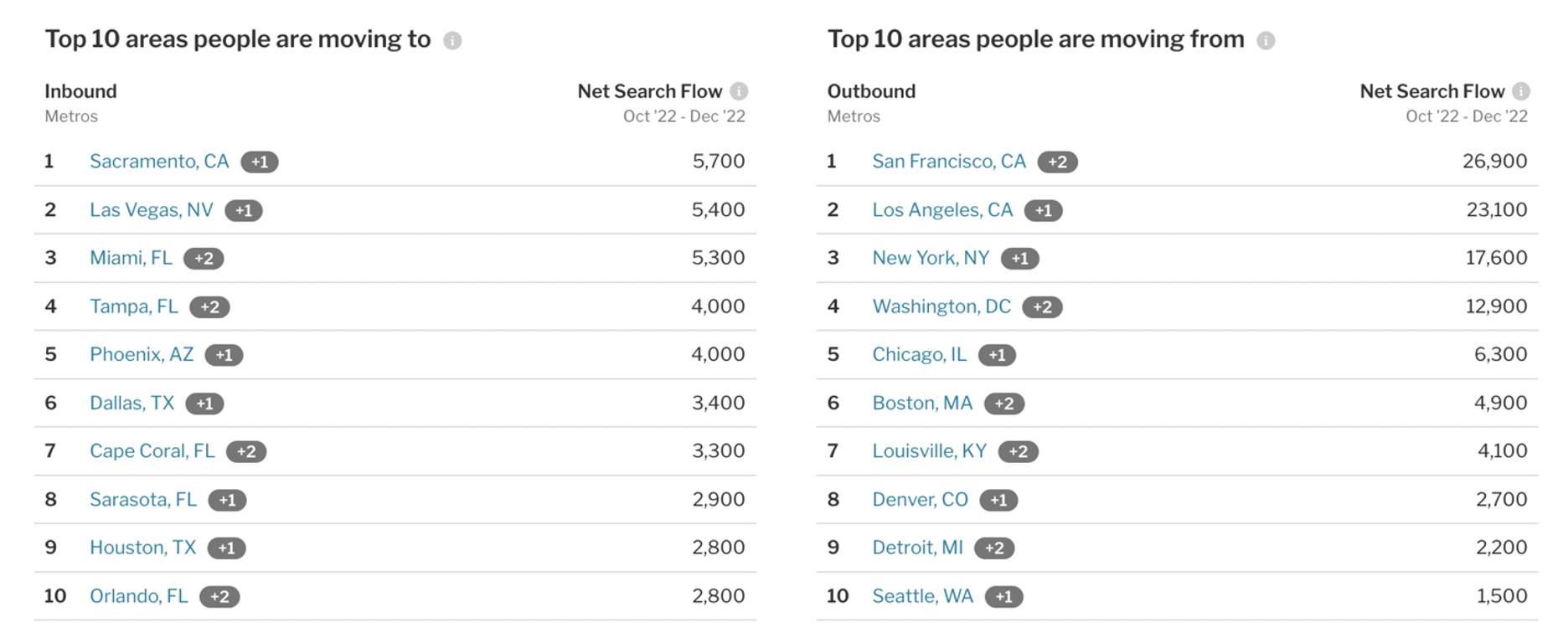 The top 10 metro areas people are moving to and from are included below.